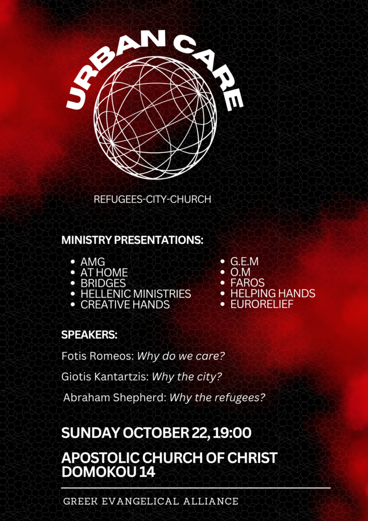 - Variety of Refugee ministries in the area of Athens – Oasis, AMC, Helping Hands, Hellenic Ministries